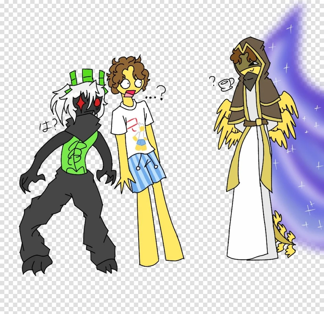 名前テラモン 年齢知らん 身長196(何となく) 性別男 性格 紳士的で承認欲求の塊野郎、優しいけどうんクソ、 外見 茶髪の天パみたいな髪型、焦茶のローブでフード被ってる、顔半分に影、黒のスカーフ、何か紳士的な白の服で足元まである丈が長い、黄色い肌、あと背中に翼6枚ある、尻尾もあってそこにも翼6枚、 設定とか 色んな剣持ってる☆、シェドレツキーと同一人物でシェドは自分の未来の姿、何かお茶会やろうとしてる(?)、2x2の師匠で剣の稽古してる、神的存在でして飛べます☆、