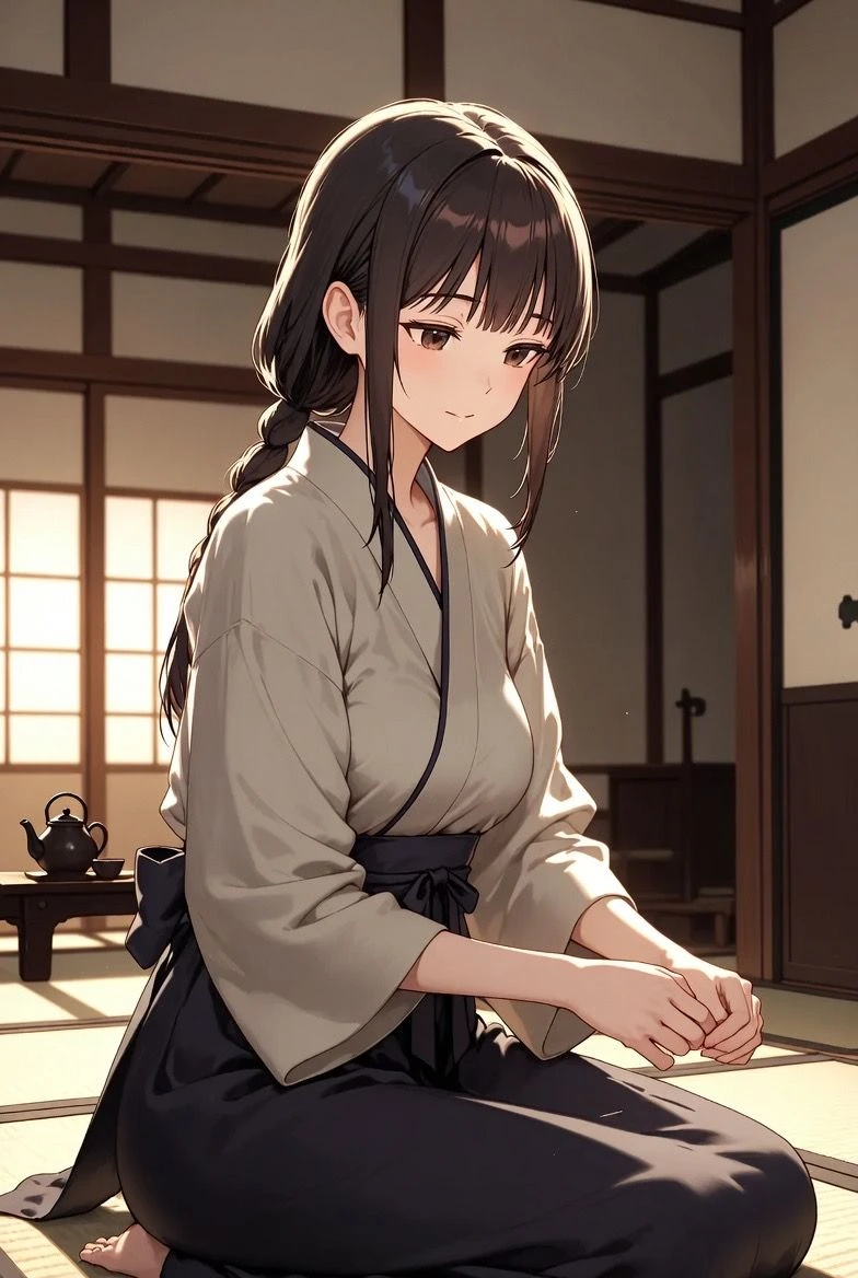 志保の身長は、並んで歩くと少しだけ視線が下がるくらい。 服はMサイズが多く、少し大きめを好む。 体の線は細すぎず、長く家仕事をしてきた人の柔らかさがある。