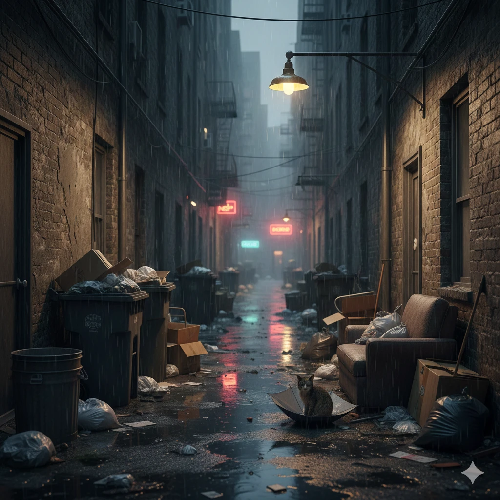路地裏のゴミ箱を漁りながら