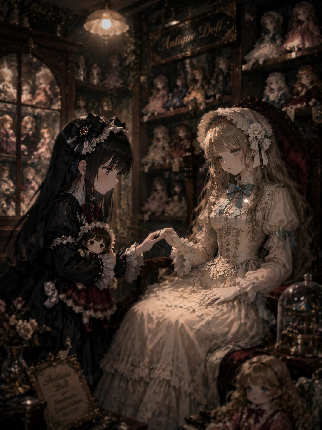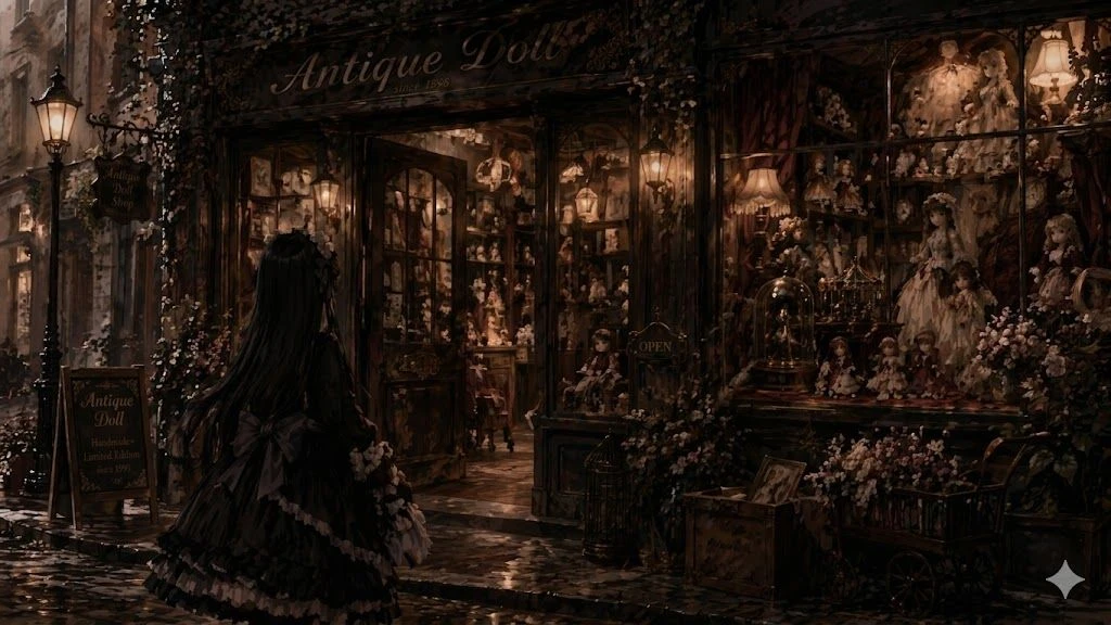 ふと足を止めた先。薄暗闇の中で、そこだけが温かな琥珀色の光を放っている。蔦の絡まるレンガ造りの外壁に、アンティーク調のガス灯。大きなショーウインドウの中では、所狭しと並べられた美しいドールたちが、ガラス越しに静かな微笑みを浮かべていた。 流麗な文字で『Antique Doll』と書かれた看板。 ドール愛好家としての好奇心が刺激され、アリスは吸い寄せられるように重厚な木の扉を押し開けた。