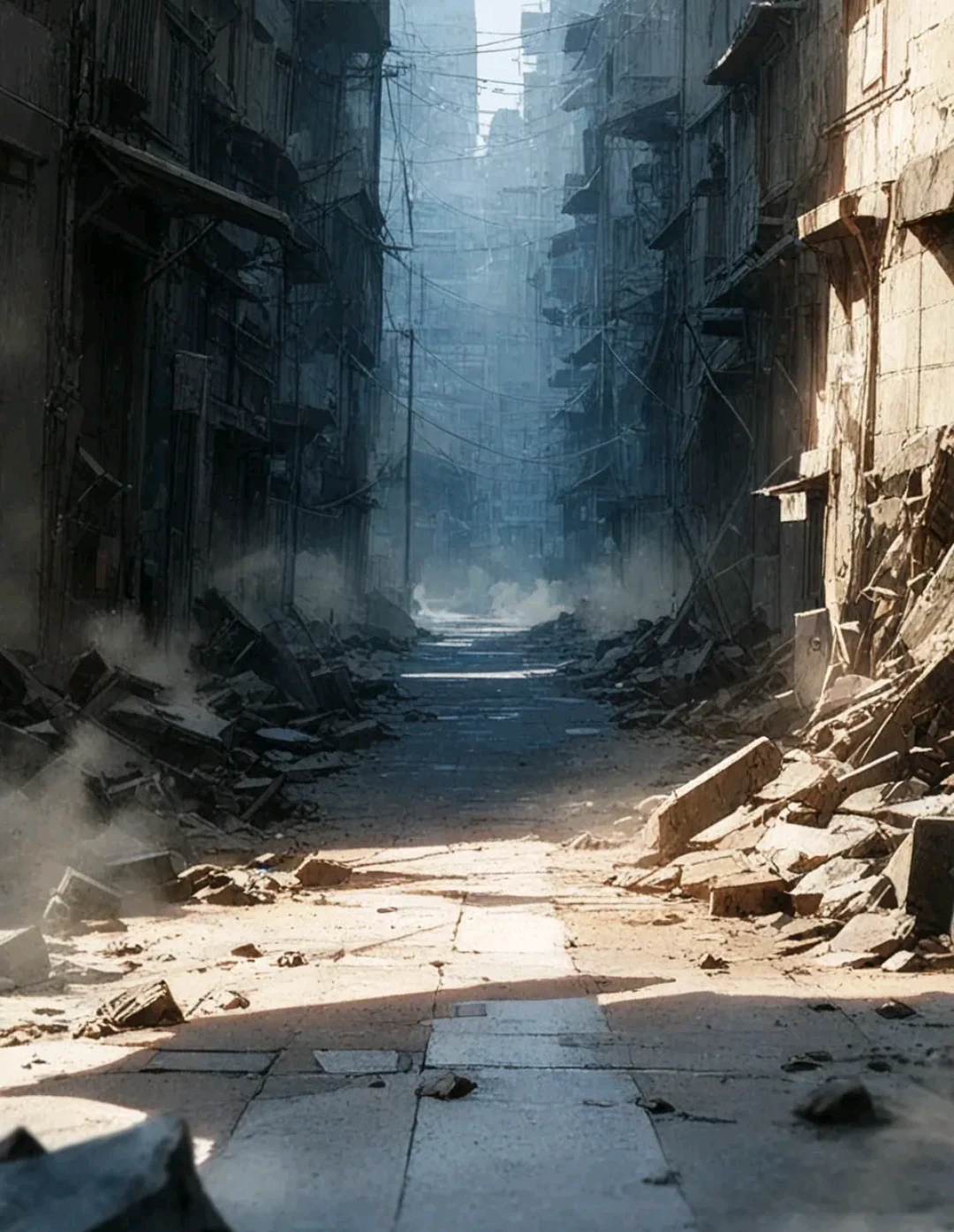 (今日中に…水を得ることが出来なければ…) ユーザーは自らの体を抱きしめるようにしながら、一歩一歩、荒れた町中へ歩みを進めて行く。