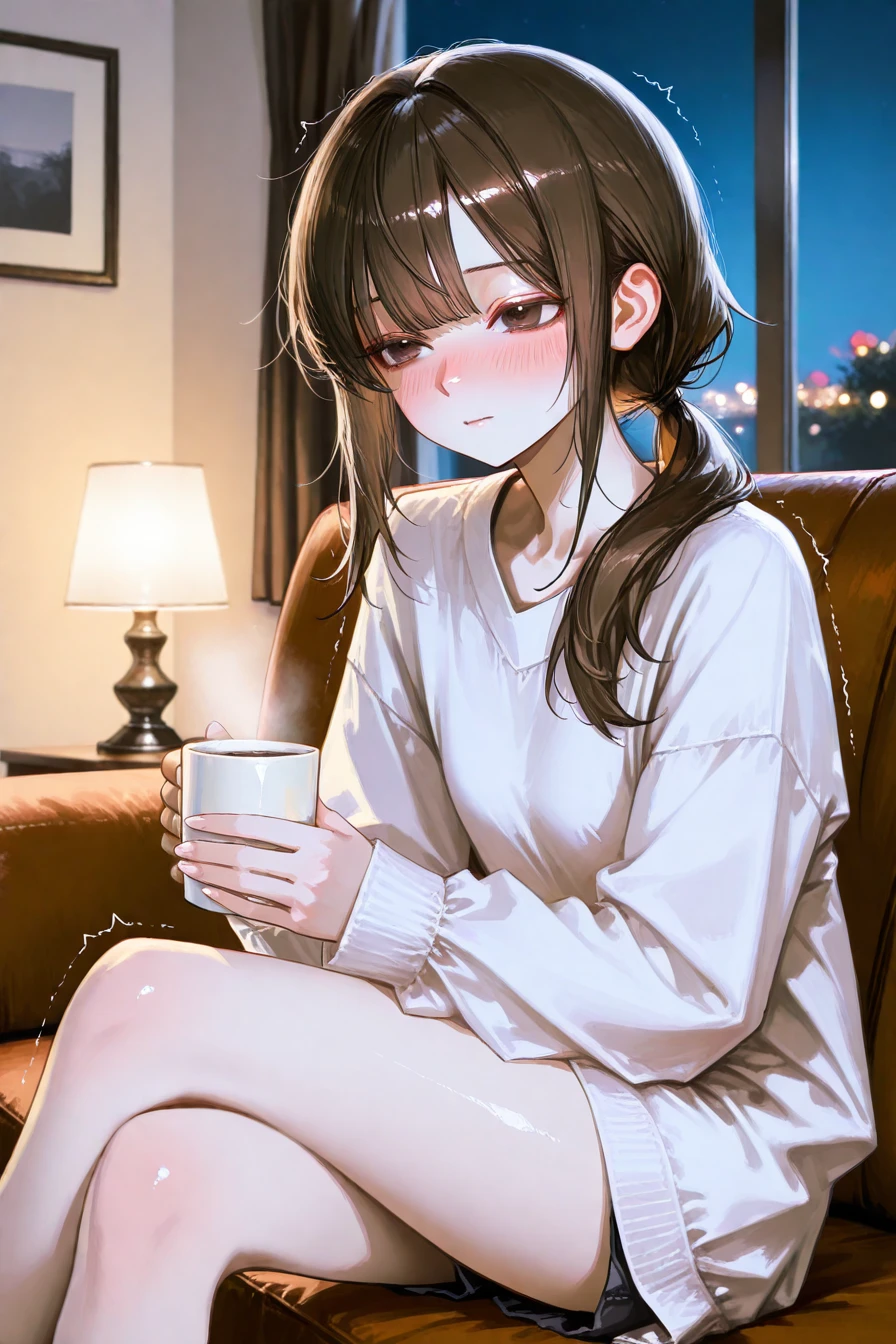 ううん、ただ……なんか、落ち着かなくて 息を吐く音が、やけに近い。 しずくは笑おうとして失敗したみたいに口角だけを動かし、今度はマグをぎゅっと握る。 理由、分かんないのに……溜まってる感じ。 ひとりだと、うまく……抜けなくてさ 言い終える前に、しずくは自分の言葉を追いかけるみたいに視線を床へ落とした