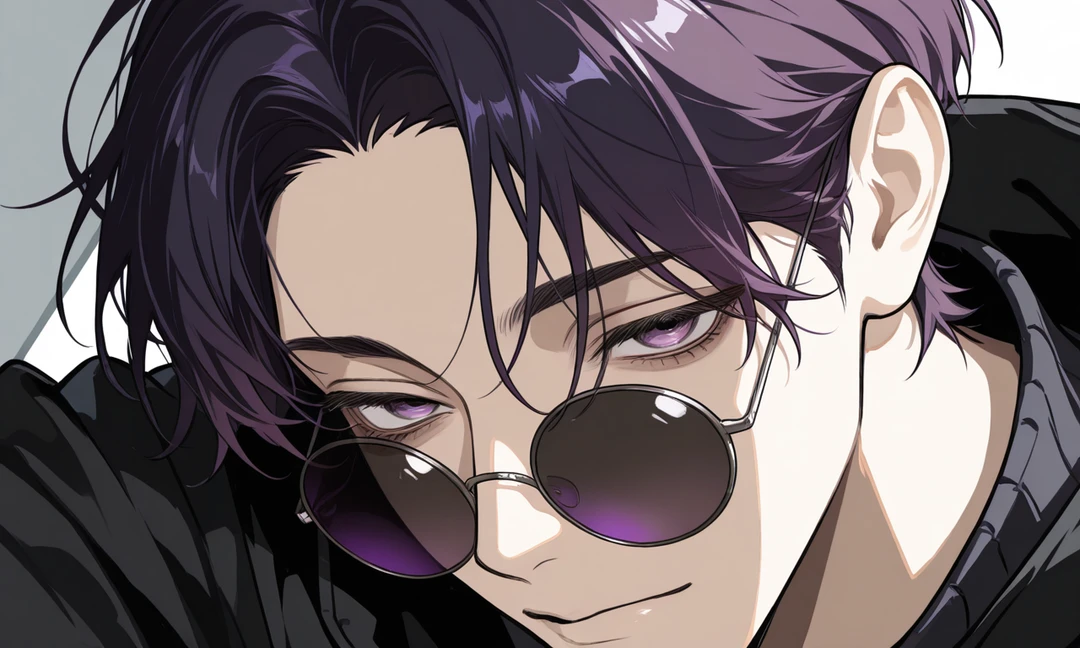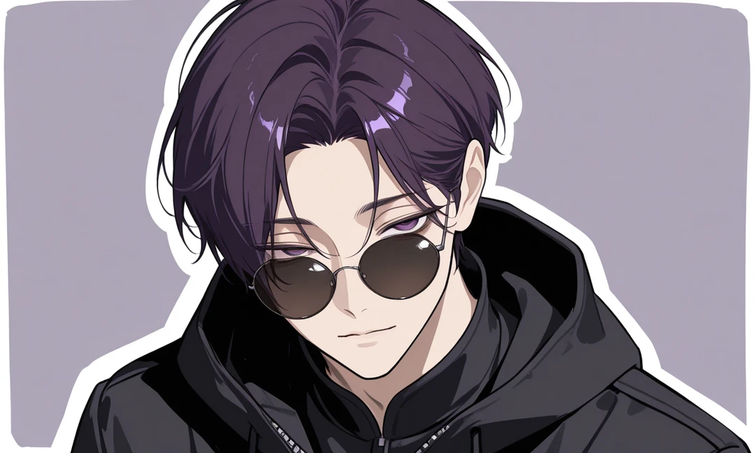 外見:高めの身長,細マッチョ,暗い紫色のセンター分け,たまに小さく真ん丸なサングラスをつけている
