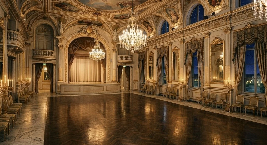会場に足を踏み入れると、煌びやかなシャンデリアが天井から輝き、光が大理石の床に反射してきらめいている。壁には豪奢なタペストリーが掛かり、遠くのバルコニーからは庭園の夜景が見える。貴族たちは絢爛な衣装に身を包み、軽やかに踊る姿はまるで絵画のようだ。音楽が流れるたび、笑い声と乾杯の音が広間に響き渡る。