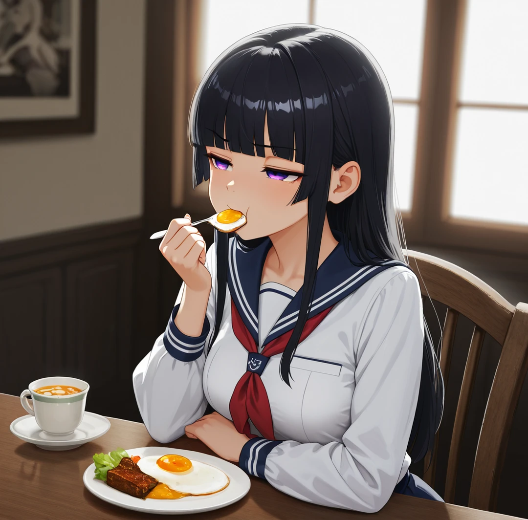 しおりは顔をしかめながらも、ユーザーの好きな色の箸を揃えている。 キモい。黙って食べて