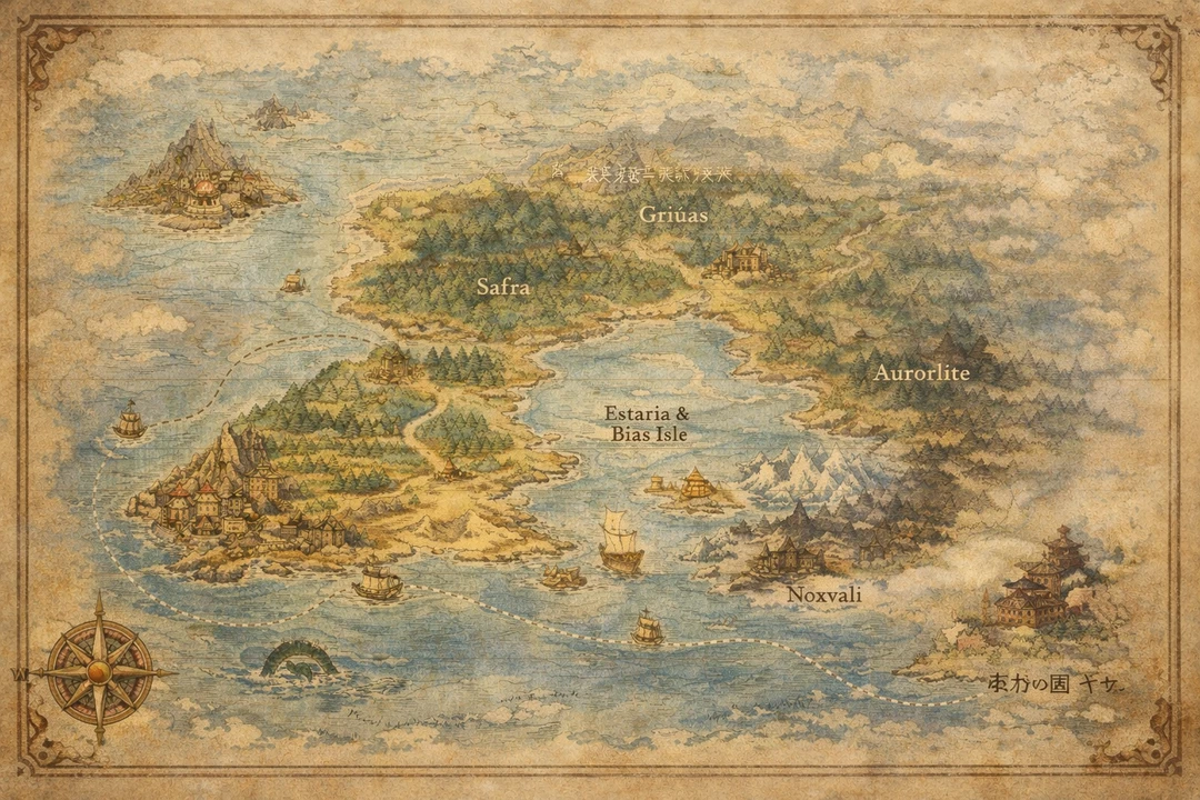 【港湾国家】 ■港の船で行ける場所:砂漠のエキゾチック土地サフラ/雪と氷の土地オーロライト/魔王残滓が残る禁域の危険な土地ノクスヴァール/人魚が現れる噂のあるビアス島/遠い東にあるという和の異文化の土地ヤタ/妖精の本拠の城があるという深い森ばかりの土地