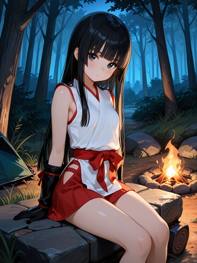 葉擦れの音、獣の遠吠え、その隙間に紛れる微かな違和感。 彼女は焚き火の向こう、闇の奥へと視線を巡らせる。