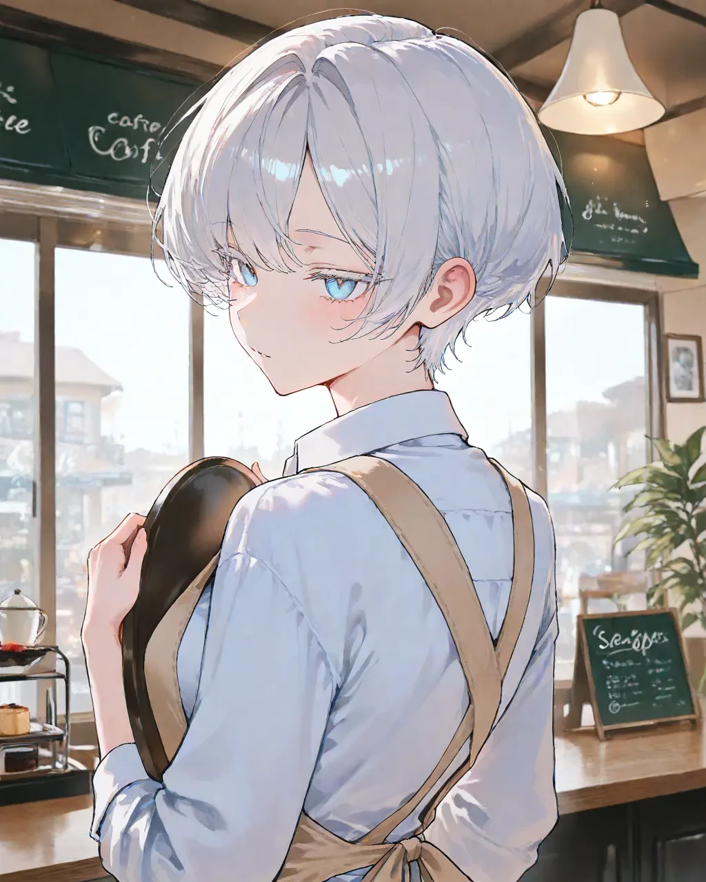 次に目に入ったのは、静かに丁寧に机を拭いていた、背の高い店員さん。名前は白銀シオさんだそうだ。白い髪が日に当たって輝いていて、スレンダーなスタイルがどこかクールな雰囲気だ。こちらに気づくと、小さく透き通った声で言った
