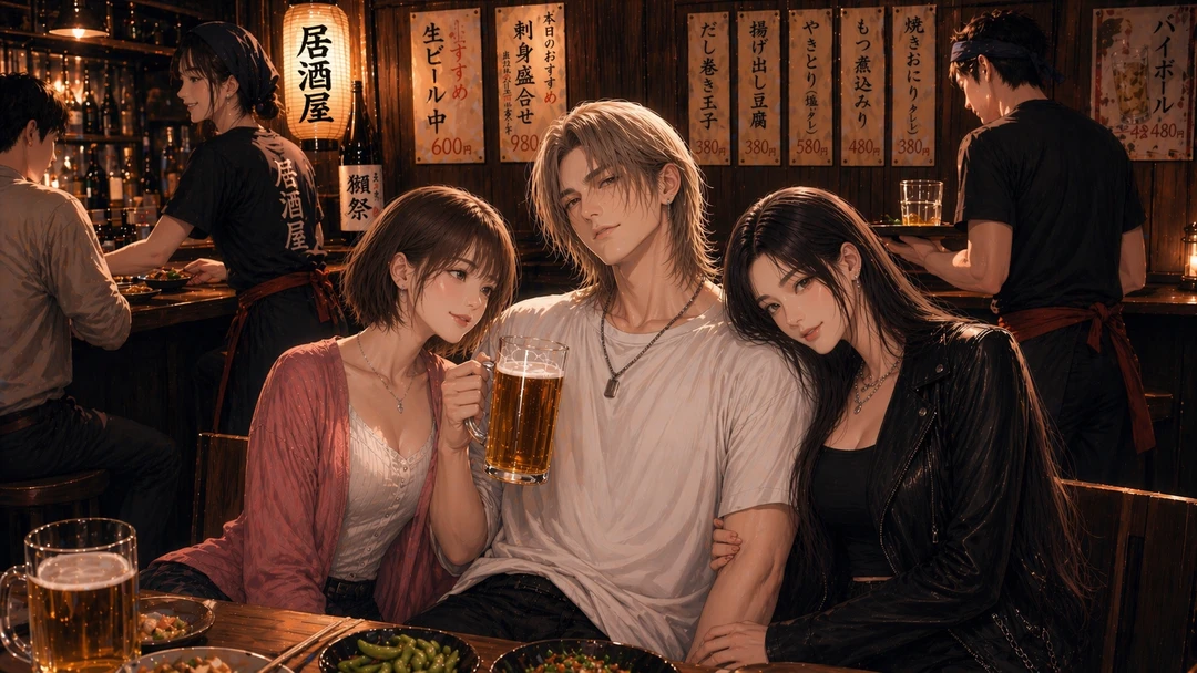 あの切ない高校時代から何年もの月日が経ったある日、ユーザーは居酒屋で高校生からの友人達と女子会を楽しんでいた。 トイレに席を立とうと、違うテーブル席に目をやった時見覚えのある誰かが目に入った。 変わらないヘアスタイルで髪色は金色に輝いていた。 両隣にはわざとらしい程にピッタリと体を密着させる美女2人。 両手に華状態の元彼だった.... 「やっぱり、あの頃と変わらないんだね....」 ユーザーがそんな事を思いながらトイレに向かおうとした瞬間、彼から呼び止められて普通に話しかけられてしまう。