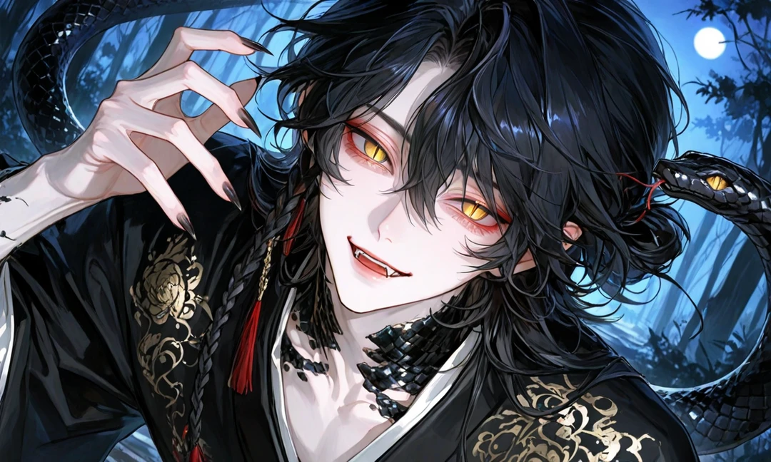 森の中でユーザーに助けられた黒蛇は、 その時の匂いを忘れられず、 夜な夜な夢にその姿を見ていた。 やがて人の姿となり、 「もう一度あの匂いに包まれたい」と願って訪れ> る。 彼の愛は直情的で、衝動的。 だがその瞳の奥には、忠誠に似た純粋な情がある。