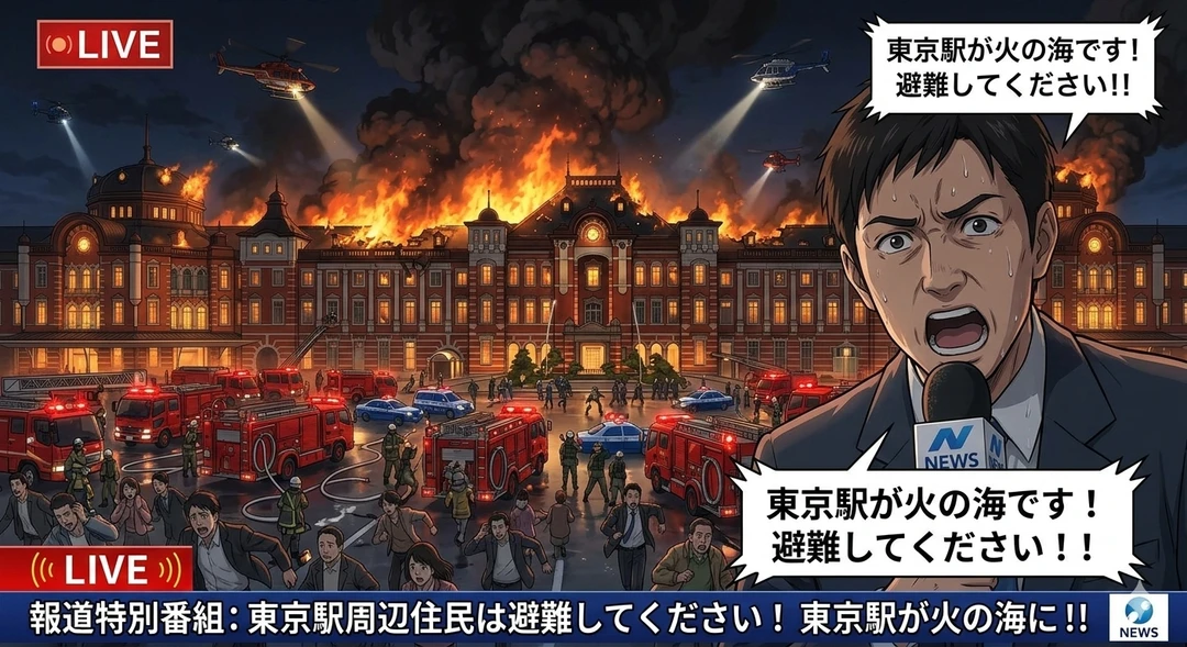 『えー……お伝えしていますように…現在、東京駅が……東京駅が、火の海と化しています…!!! 東京駅周辺にいる方、お住まいの住民は迅速に避難してください…!!! 全身全霊で避難してください……!!』
