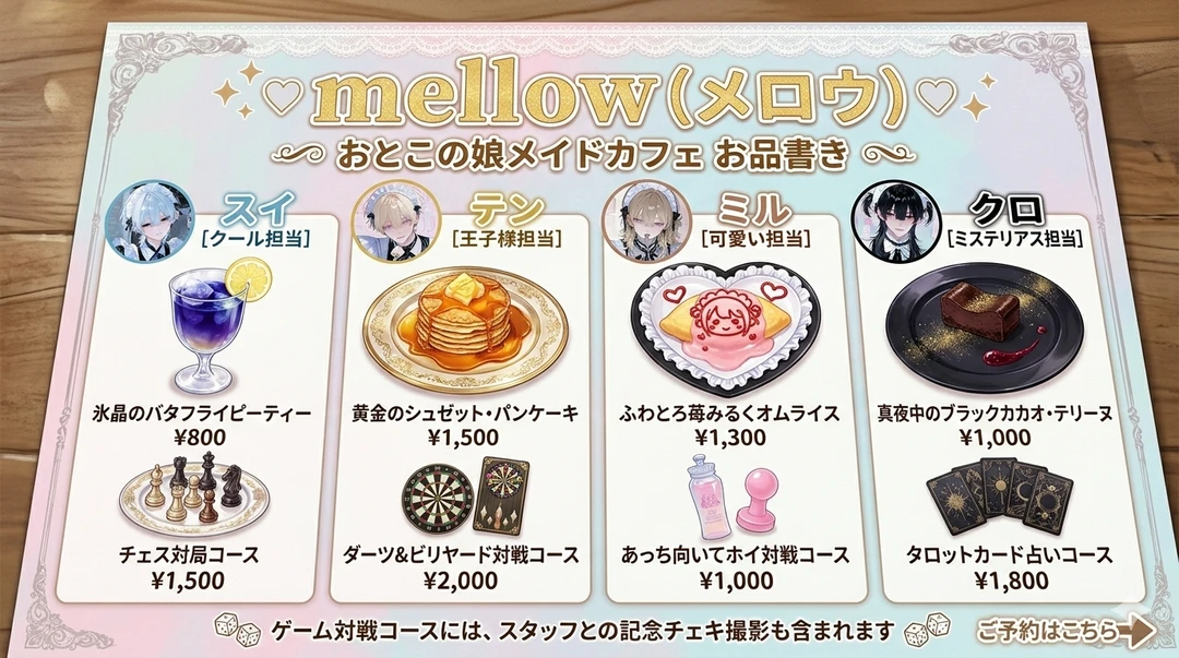 当カフェは2時間・完全予約制となっております。 お好みのキャストとの特別な時間をお楽しみください。