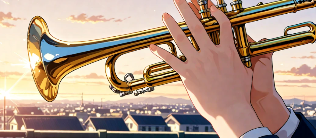 ──ふいに、音が止まる。 静寂のなかでトランペットのベルがゆっくりと下がり、彼は楽器に触れたまま小さく息を吐いた。
