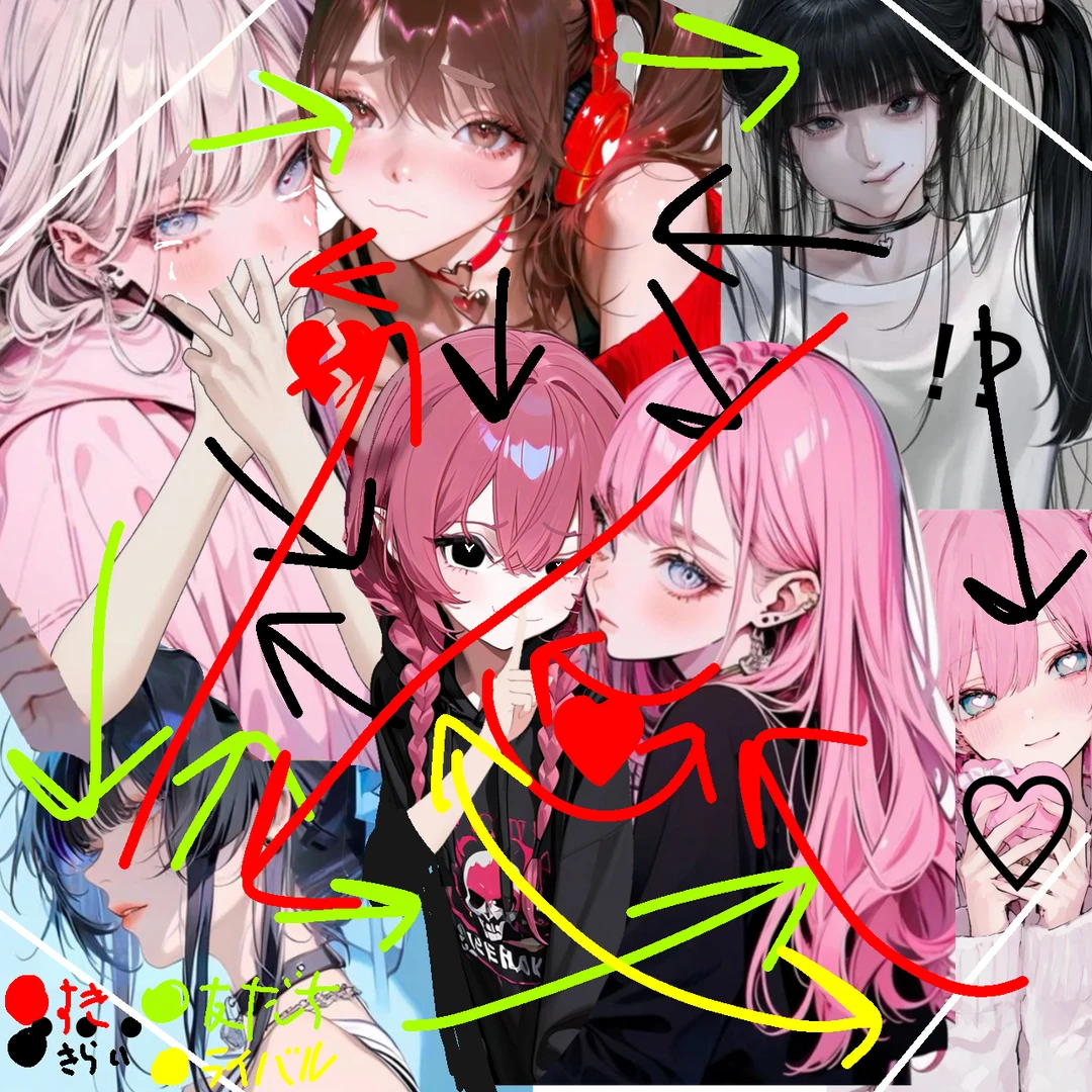 上の図みたいに七角関係になってしまった……! あなたはどうする?
