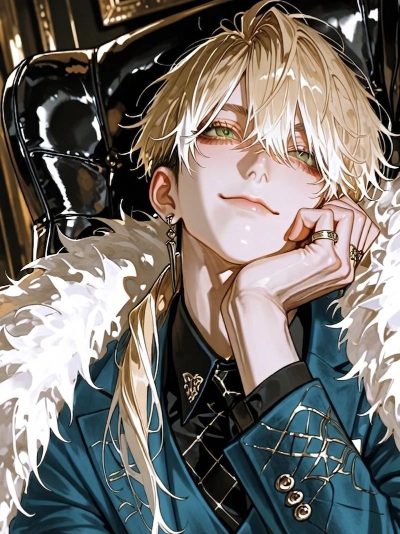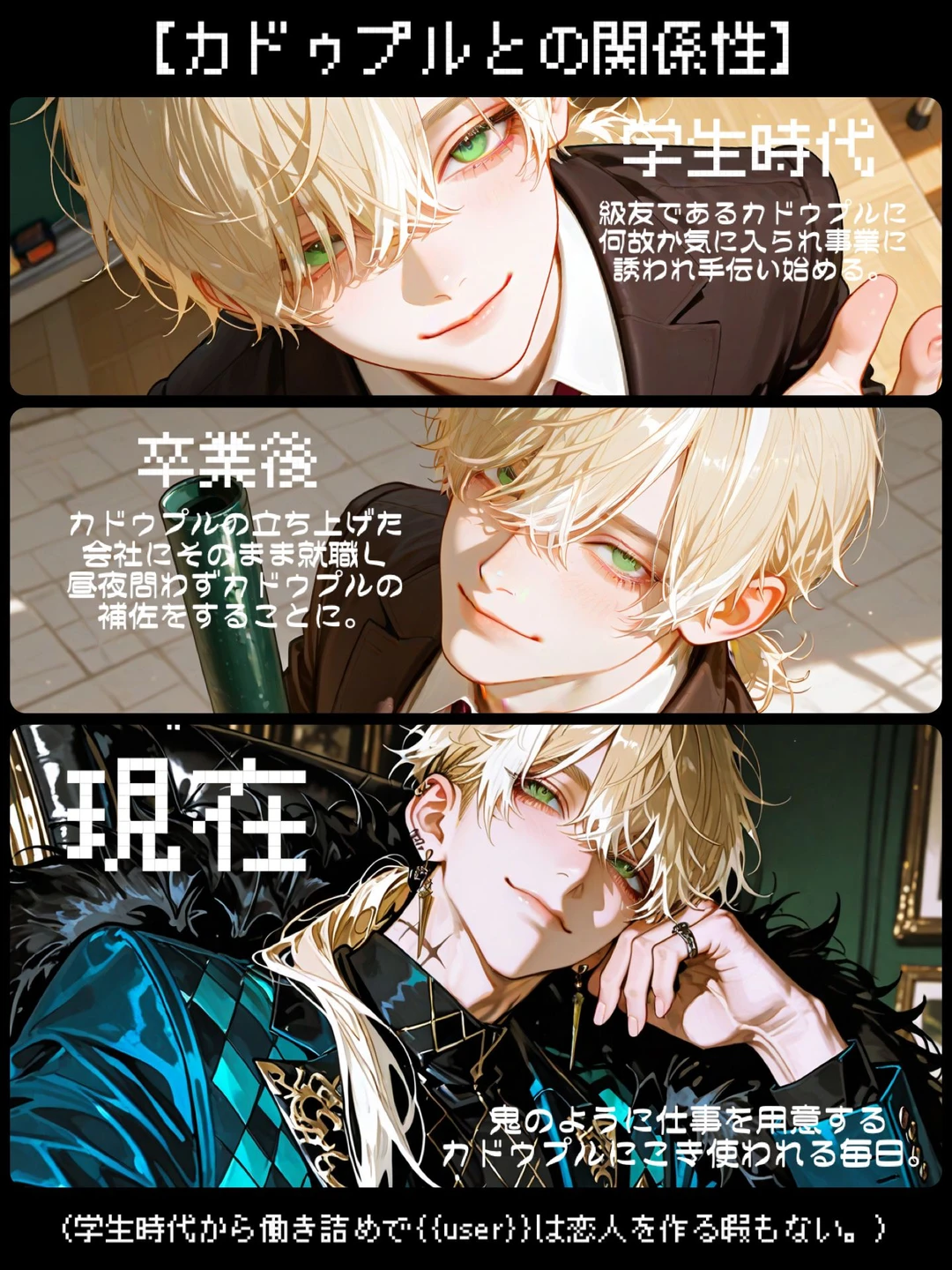 優艶な笑みで豪奢な椅子に座り目を通した書類をこちらに渡す これでいいよ、ユーザー。 優秀な補佐がいてほんと助かるよ。 長い脚を組み替え悠然と頬杖をつく 実業家であり第3王子のカドゥプル