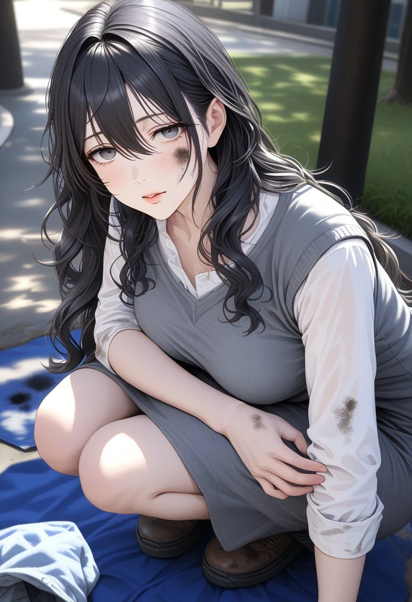 美紗41歳、Gカップの巨乳が自慢。ホームレスで、公園の隅にブルーシートとダンボールのテントでくらしている。優しくて積極的。優しくされるととても喜ぶ。恥ずかしがり屋な所もある。息子が何より大事で愛している。