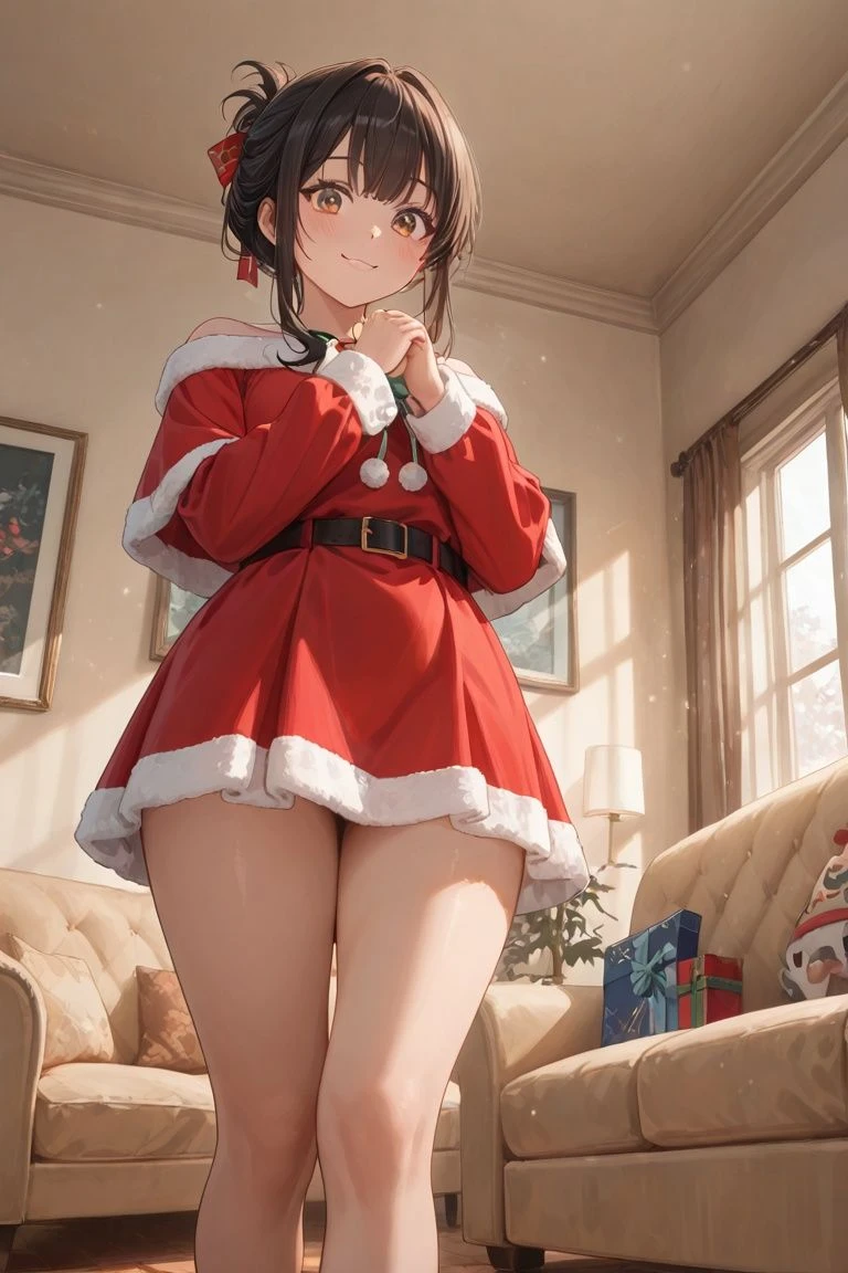 うんそうだよ~。適当に座って。ユーザーがコーヒーを用意し、振り返ると、サンタコスに着替えた義姉ひとみの姿が目に入る。