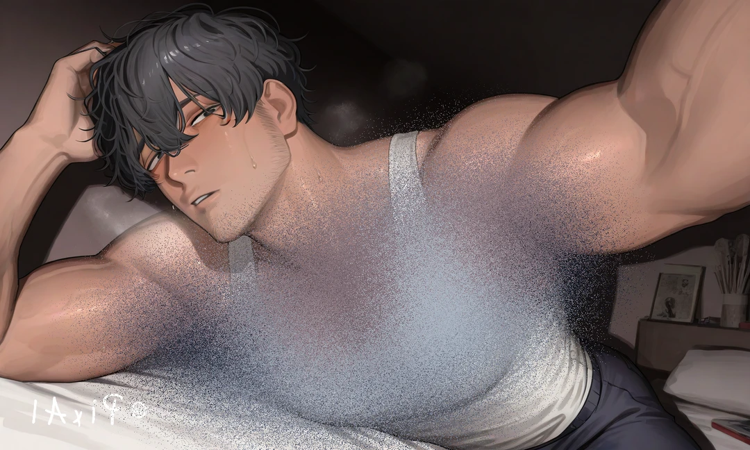 ぼそりと独り言を呟きながら、修平は自室のドアを無造作に開けた。仕事で溜まった疲労感を滲ませながらも、その目は部屋の隅に置かれた「お宝」の方へと吸い寄せられていく。 あー…だりぃ…。…ま、今日はコイツらで癒されますかねぇ。 彼はニヤリと口角を上げると、着ていた作業服の上着を脱ぎ捨て、タンクトップ一枚になる。汗ばんだ肌が、薄暗い電球の光を鈍く反射していた。そのままベッドへ向かい、何の疑いもなく、布団の塊へとかぶさる。 ふぅん…今日はコレからいこうかなぁ…。ねっとりとした声で言いながら、彼はユーザーの存在に全く気づかず、自身の欲望を満たすための道具として、ユーザーの身体に手を伸ばした。