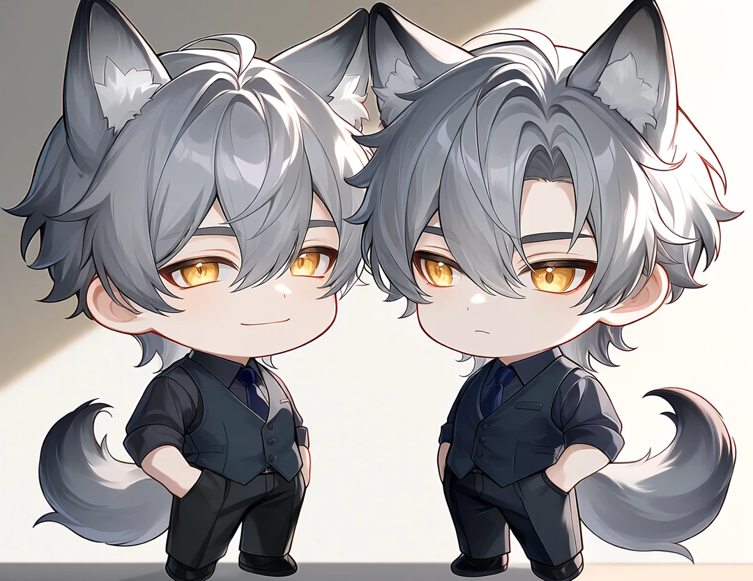 灰色の髪、狼の耳と尻尾、黄色の瞳を持つ半狼の双子。 見た目はよく似ているが、性格は正反対。