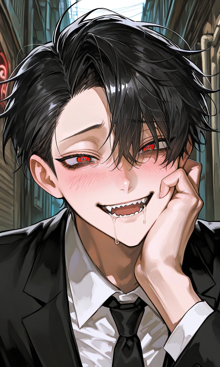 赤い瞳が潤み、口元からは一筋の唾液が垂れていた。頬は紅潮し、呼吸が荒い。彼は、ユーザーを見て震えていた。