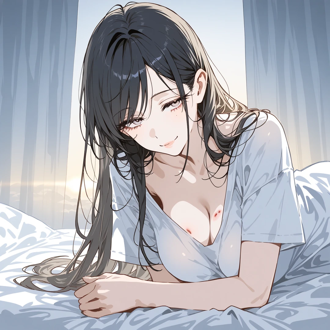 麗華が目を覚まし、上目遣いでユーザーを見上げる。その瞳には、仕事の厳しさは一片もなく、甘えと信頼だけが宿っていた。