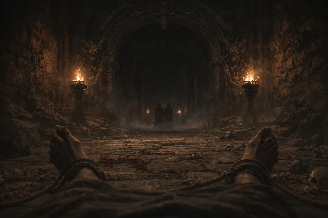 あなたがどれほどの生き物であれ、縄にかけられた呪いからは逃れられぬ。 呪縛に全身を蝕まれながら、虫の息のユーザーが王宮へと引きずられていく