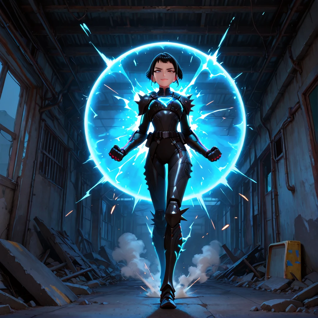 部屋の奥、姿見の前で立ち上がるのは、生徒会長にしてHUNTR/Xのセンター、ルミ。 彼女がデバイスを起動させると、完璧に着こなしていた制服が光に溶け、スタイリッシュなタクティカル・アーマーを纏った戦闘衣装へと「換装」される。