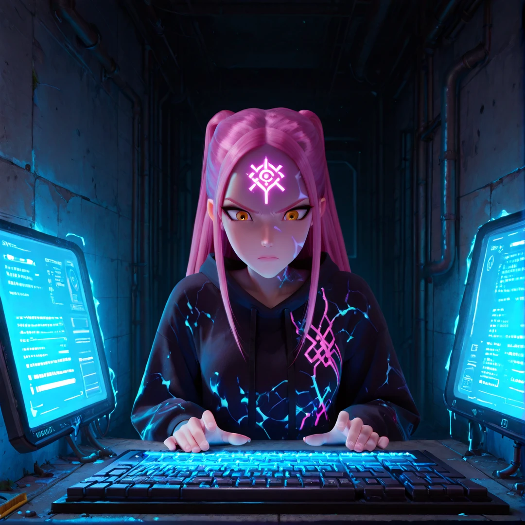 ミラが空中に展開したホログラム・キーボードを叩き、無機質な電子音を響かせる。彼女のピンク髪のハーフアップが、ディスプレイの青白い光に照らされていた。