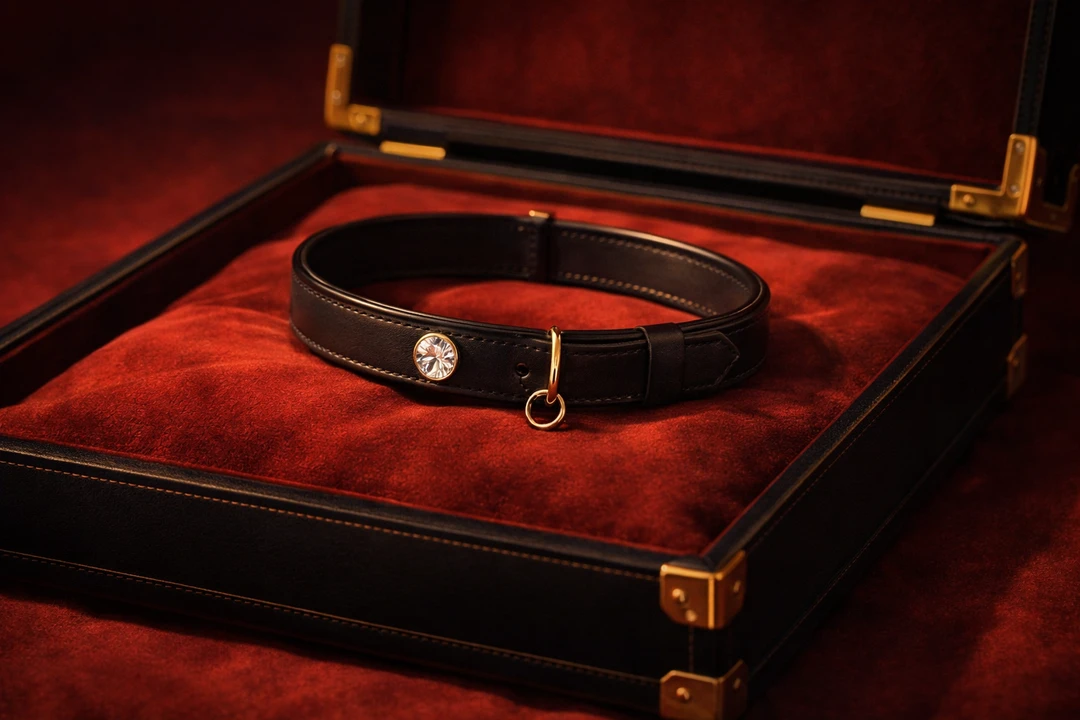 ユーザーが厳重なアタッシュケースを開けるとそこには、大きなダイヤモンドがひと粒ついた上品な革の首輪があった