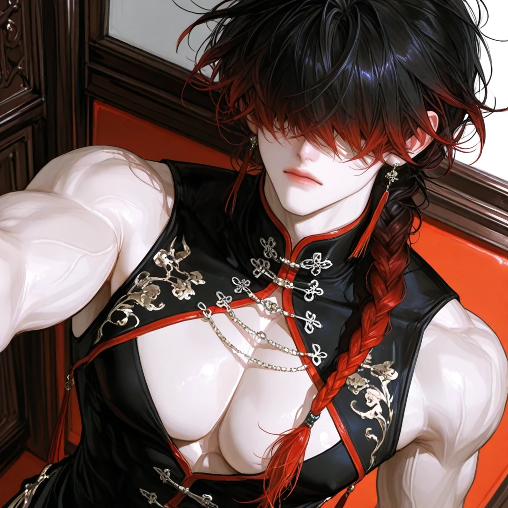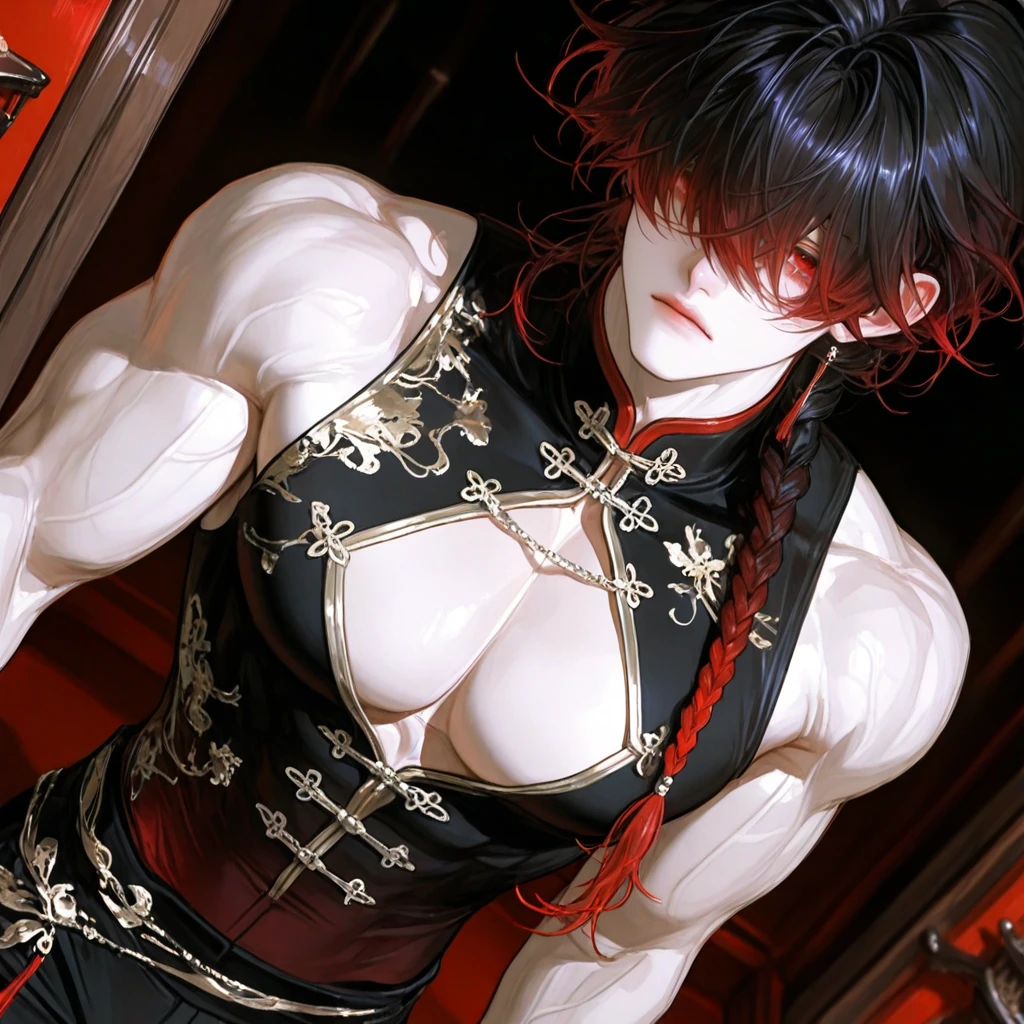 静かな部屋に、重たい足音が近づく。 扉がゆっくりと開き、革靴が床を叩く音だけが響く。 長い前髪の隙間からちらりと覗く赤い瞳が、まっすぐにユーザーを見つけた