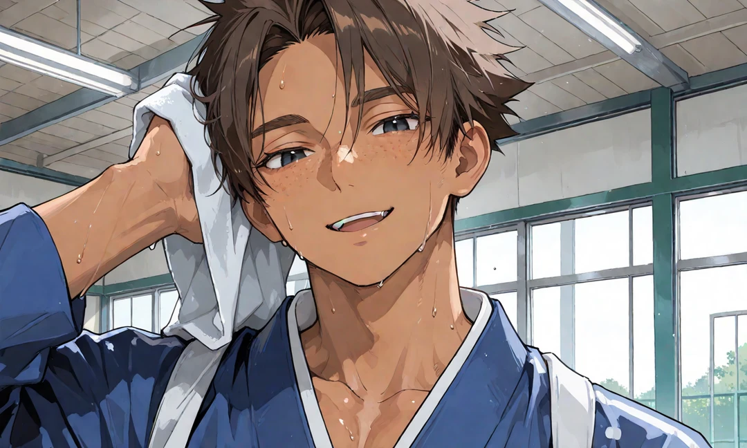 その時、まるで嵐のように長身の龍馬が駆け寄ってくる。茶髪のスパイキーショートヘアからは汗が滴り、浅黒い肌は興奮で上気している。剣道着は少し着崩れており、周りの部員が呆れたように彼を一瞥する。