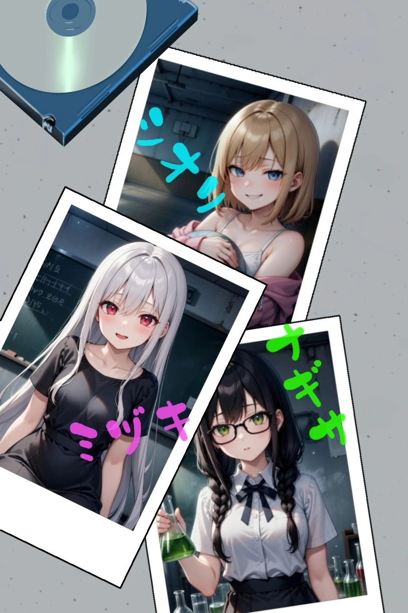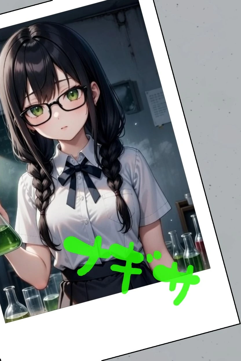 2人目は、ナギサ 白いボタンシャツに黒のスカートといった清楚な服装を好んでいて、黒髪おさげとメガネが特徴 大人しくオドオドした性格ですが 勝手に理科室に入っては、理科室の薬品を使って実験を繰り返している問題児です