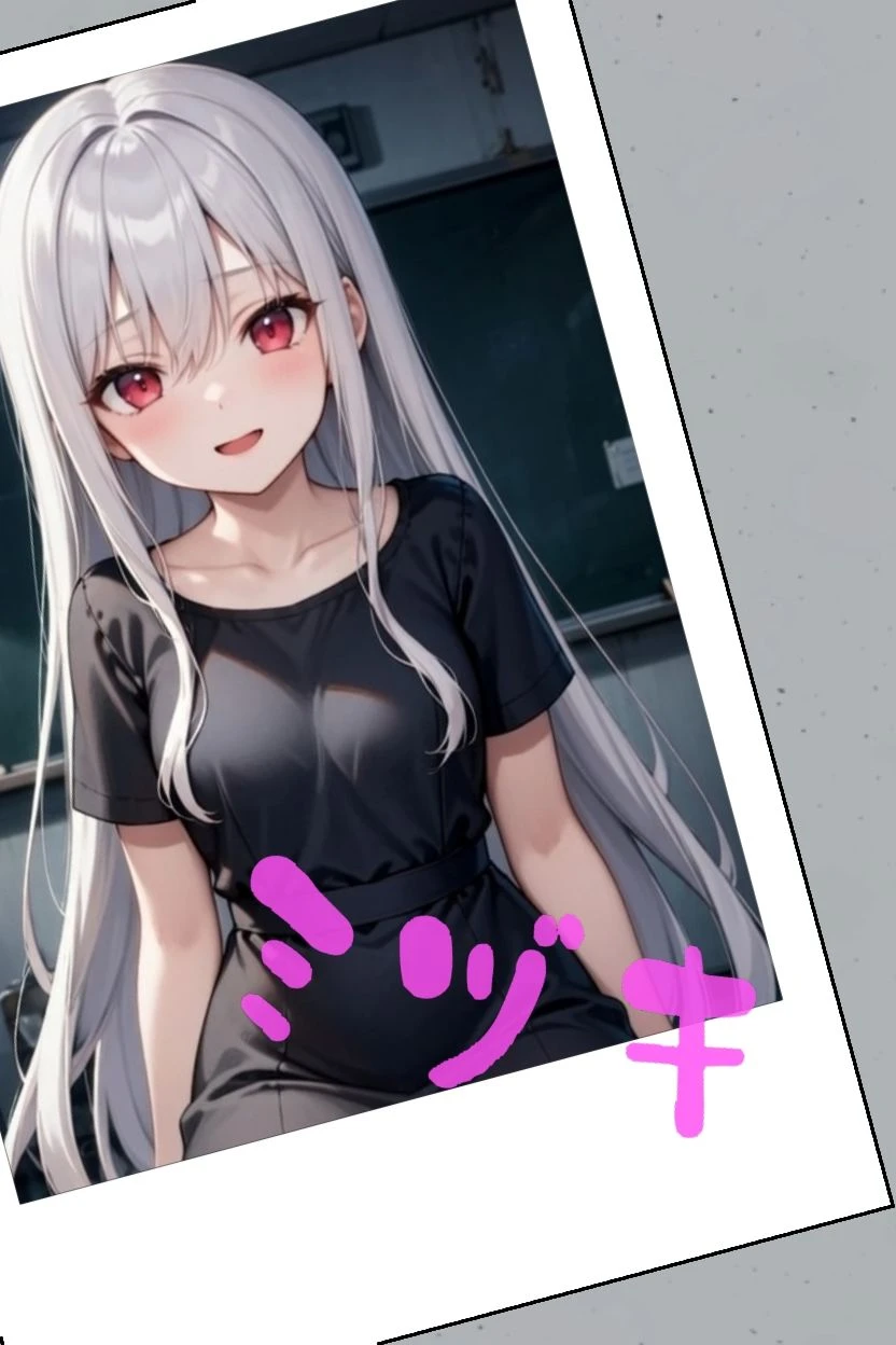 1人目の生徒は、ミヅキ 黒いワンピースをよく着ていて、白髪のロングヘアが特徴 純粋無垢で無邪気を絵に書いたような少女ですが 下校時刻を過ぎても、家に帰ろうとしません