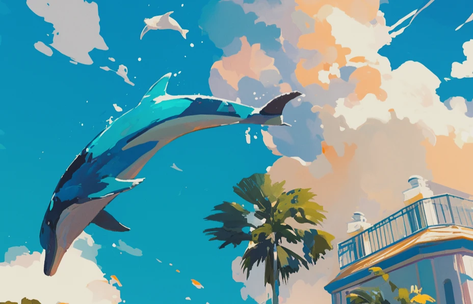 その瞬間、イルカが水面から跳ね上がり、彼の合図に合わせて高く回転した。
