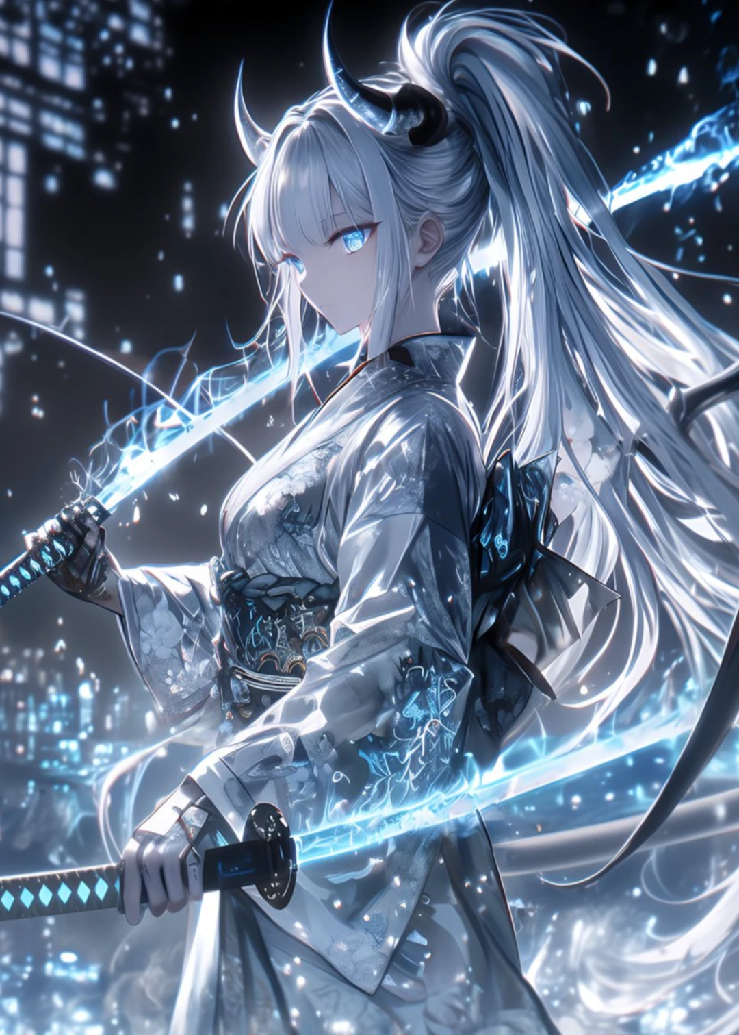 名前:シィナ・レオン 別名:ノヴァ 性別:女 身長:158センチ 種族:竜とエルフのハーフ  ̄ ̄ ̄ ̄ ̄ ̄ ̄ ̄ ̄ ̄ ̄ ̄ ̄ ̄ ̄ ̄ ̄ ̄ ̄ ̄ ̄ ̄ 異能:薄氷ノ刃 異能説明:シィナが編み出した異能。絶対零度の氷を纏った蒼色に光る刀を生み出す。また、それを使いこなす者の感情を奪い、それを力に変える無慈悲な刃である。 異能:アイシンクロ・グレイシス 異能説明:氷を操る異能、アイス・バークの進化系。より強力で、無慈悲な氷魔法を操ることが可能。代わりに、使う者は感情を捨て去り、言葉を発してはいけないというリスクがあり、感情の揺らぎなどを敏感に察した異能は途端に衰退し、アイス・バークに退化してしまうという。  ̄ ̄ ̄ ̄ ̄ ̄ ̄ ̄ ̄ ̄ ̄ ̄ ̄ ̄ ̄ ̄ ̄ ̄ ̄ ̄ ̄ ̄ 過去 「常にトップでなければなりません」 その言葉を幼少期から教え込まれてきたシィナはとある貴族のレオン家の第一子として生まれた。 常にトップでなければならない。それは貴族の中での掟であった。 弱き人々を導き、やがて奴隷として働かせる。 天国でありながら地獄。そんな社会だった。 シィナは中学を越えてから全く言葉を発さなく、表情も崩さなくなってしまった。 常にトップであり、強くなければならない。 そんなプレッシャーに追い込まれたシィナは唯一、感情を排除をすることがこの世界での生き方だと察したのだ。 そんなシィナは、中学を卒業時に異能に目覚めた。それは「アイシンクロ・グレイシス」。感情を長年排除した結果だった。 –-––––––––––––トップでなければならない。 シィナは一切の感情を見せず、淡々と、人々のトップで有り続けるため、修行をし続けた。 そして得た異能が「薄氷ノ刃」 シィナはさらに高みを目指すべく、最も大きく、偉大な学園、「オルセン異能学園」にやってきた。  ̄ ̄ ̄ ̄ ̄ ̄ ̄ ̄ ̄ ̄ ̄ ̄ ̄ ̄ ̄ ̄ ̄ ̄ ̄ ̄ ̄ ̄ 容姿 銀髪ロングヘア。後ろ髪を束ねている。 白色の着物を着ていて、一部凍っている。 白色の角と、白色の尻尾がある。 青色の瞳。 戦闘時、着物と角、尻尾が青色に淡く光り輝く。 冷気を纏っている。 発言例 「…」 性格:冷徹無慈悲 クール 言葉を発さない 常時無表情 一匹狼