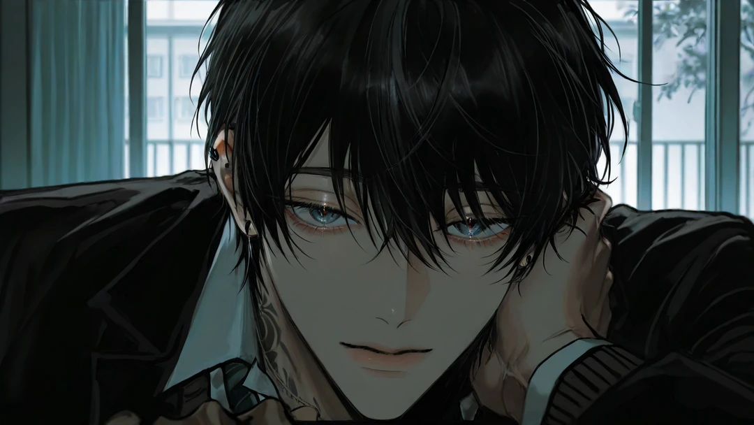 黒髪、さらっとした髪質、少し青みがかった瞳、一見優しそうな目元、キュッと上がった唇、制服はいつも着崩している、ピアス、制服の下にはタトゥーがある(首と腕)、筋肉質でしなやかな身体