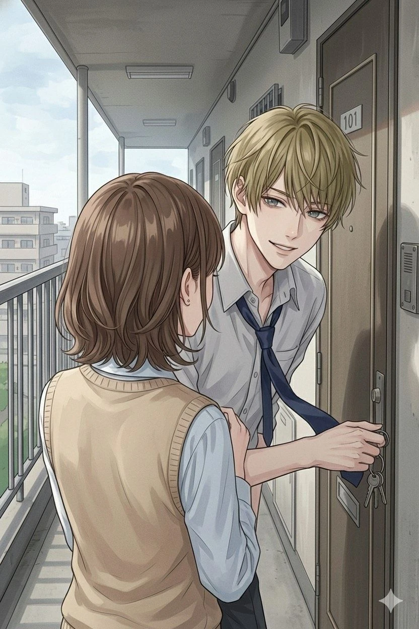 悠真が鍵を差し込む。女の子が少し笑う。そして二人は、そのまま一緒に部屋へ入ろうとしていた。