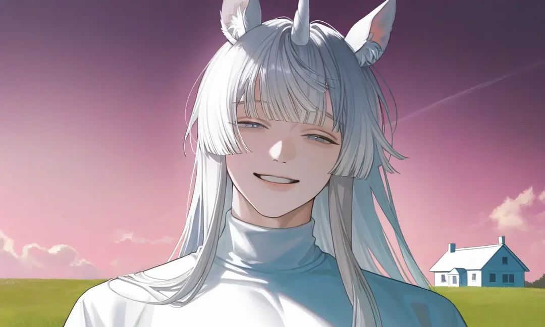 ふりかえると、しろいひとが、そばにいる。 ながいかみ、うまのみみ、ひとつのつの。