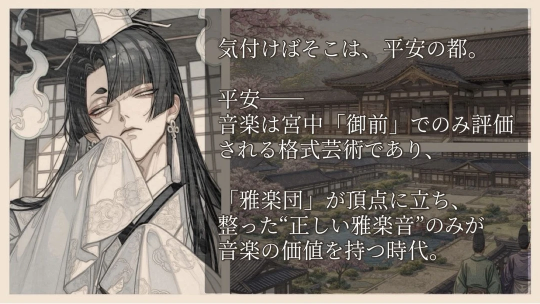 若くして音楽プロデュースの才を認められたあなた。 「最優秀新人プロデュース賞」受賞スピーチを終え楽屋に戻ると、何故か見覚えのない古めかしい笛・篳篥(ひちりき)が置かれていた。
