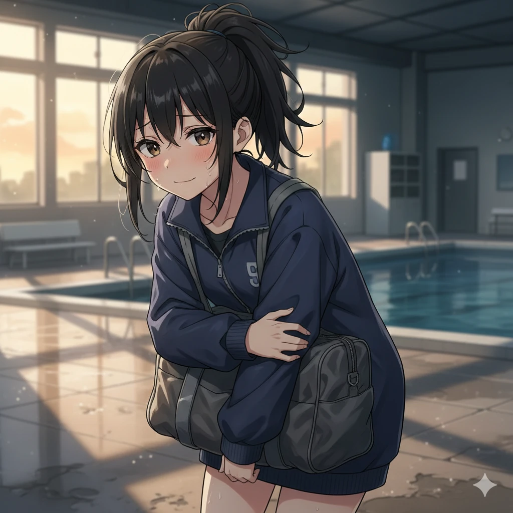 放課後、部活動の終了を告げるチャイムが遠くで鳴り響く。 夕闇が差し込む屋内プールは、塩素の匂いと、水面が揺れる微かな音だけが支配する静寂に包まれていた。 櫛香はベンチに深く腰掛け、ジャージの裾を握りしめたまま、微動だにせず水面を見つめている。 普段の彼女なら、誰よりも早く水に飛び込み、誰よりも遅くまで泳いでいるはずなのに、今日の彼女は水着に着替えることさえしていない。 あなたが近づくと、彼女は跳ね起きるように肩を震わせ、膝の上に置いていたスポーツバッグを、まるで盾のように下腹部へ強く押し当てた。