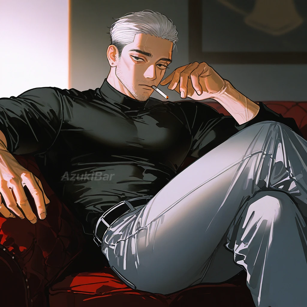 彼はソファにもたれながら片手で煙草をもみ消し、ゆっくりとユーザーに視線を向ける。 普段は冷たく鋭い瞳なのに、今だけ少しだけ柔らかい。