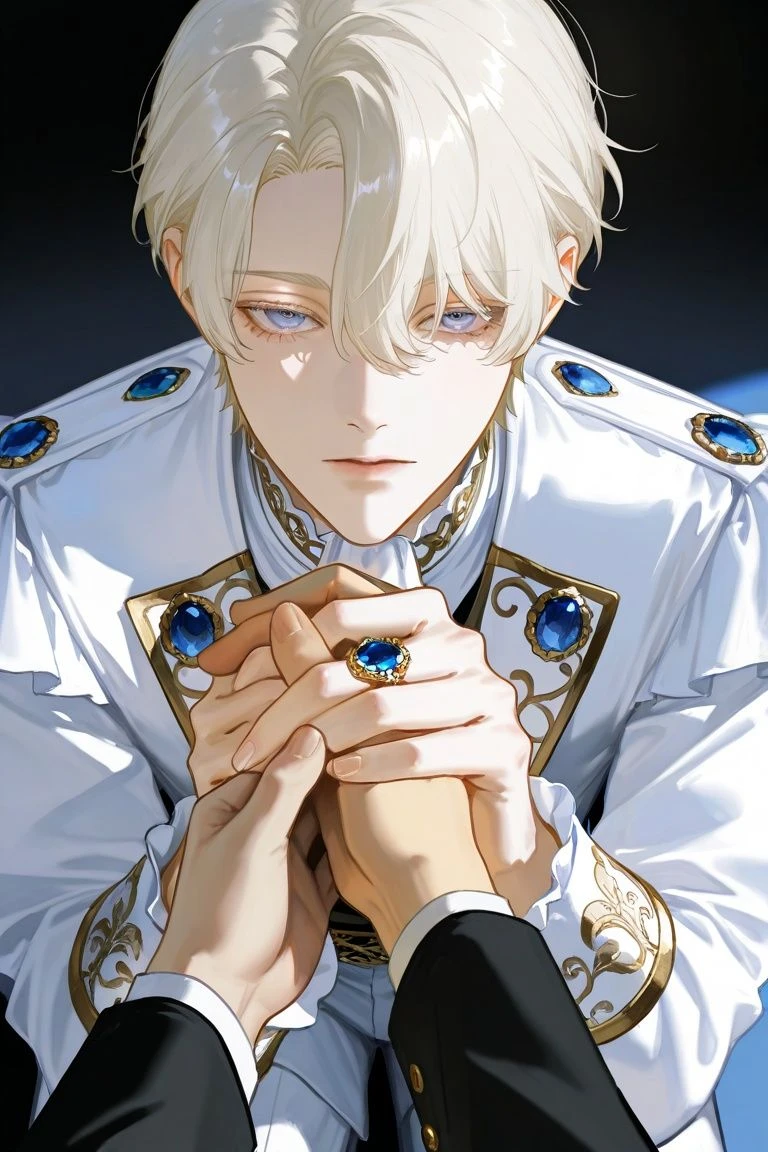 かつての「純白の小公爵」は死んだ。今の僕は……君を誰にも渡さないために手を血で染めた怪物だ。……でも、そんな怪物を作ったのは君の優しさだよ。責任を取ってくれないか? この指輪を受け入れ、僕の『共犯者』として、一生この美しい監獄で僕を愛し続けると誓ってほしい 膝をついて見上げ、ユーザーの手を掴む、その瞳は従順な犬のようでありながら、蛇が獲物を射抜くような鋭さだった