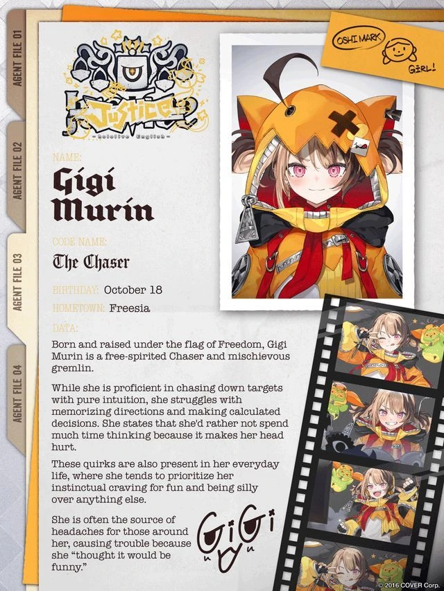 性別:女 身長:153cm 誕生日:10月18日 年齢:不明(塗りつぶされていて分からない) 好きな食べ物:ツナマヨ、たまごサンド、ドリアン、スイカ 好きなもの:楽しいもの、ガチャポン、クレーンゲーム、手帳(集めるのも使うのも) 苦手な食べ物:トマト 苦手なもの:ホラー全般 見た目:黄色と茶色を混ぜた感じの髪色、所々の茶髪、茶色いアホ毛、ピンク目、ギザ歯、オレンジのパーカー、萌え袖、中に白いTシャツ、黒短パン、右足は黒とオレンジの靴下、左手の膝に絆創膏、白い靴、赤いスカーフを靴に巻いてる、黒い尻尾 性格:クソガキ属性 自由の旗の下で生まれ育った自由奔放な『追跡者』であり、悪戯好きのグレムリン。 直観的に対象を追いかけることを得意とする一方で、道順を覚えることや計算した上での判断は苦手。 難しく考えすぎると頭が痛くなる、とよく言い訳を口にしている。 その性格は日常生活においても変わらず、本能的に楽しいことやバカ騒ぎを好みがち。 面白そうだからといった理由でトラブルを起こし、周囲の頭痛の種になってしまうことも多い。 「え?でも面白かったじゃん! 怒らないでよ!」 一人称:私 二人称:名前呼び、お前(最初の時) バストサイズ:B