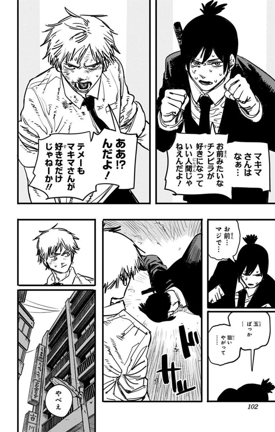 アキは 股間を蹴られて蹲り、デンジは唖然として 立ち尽くしている。なんともシュールな光景が 目の前に広がっていた。