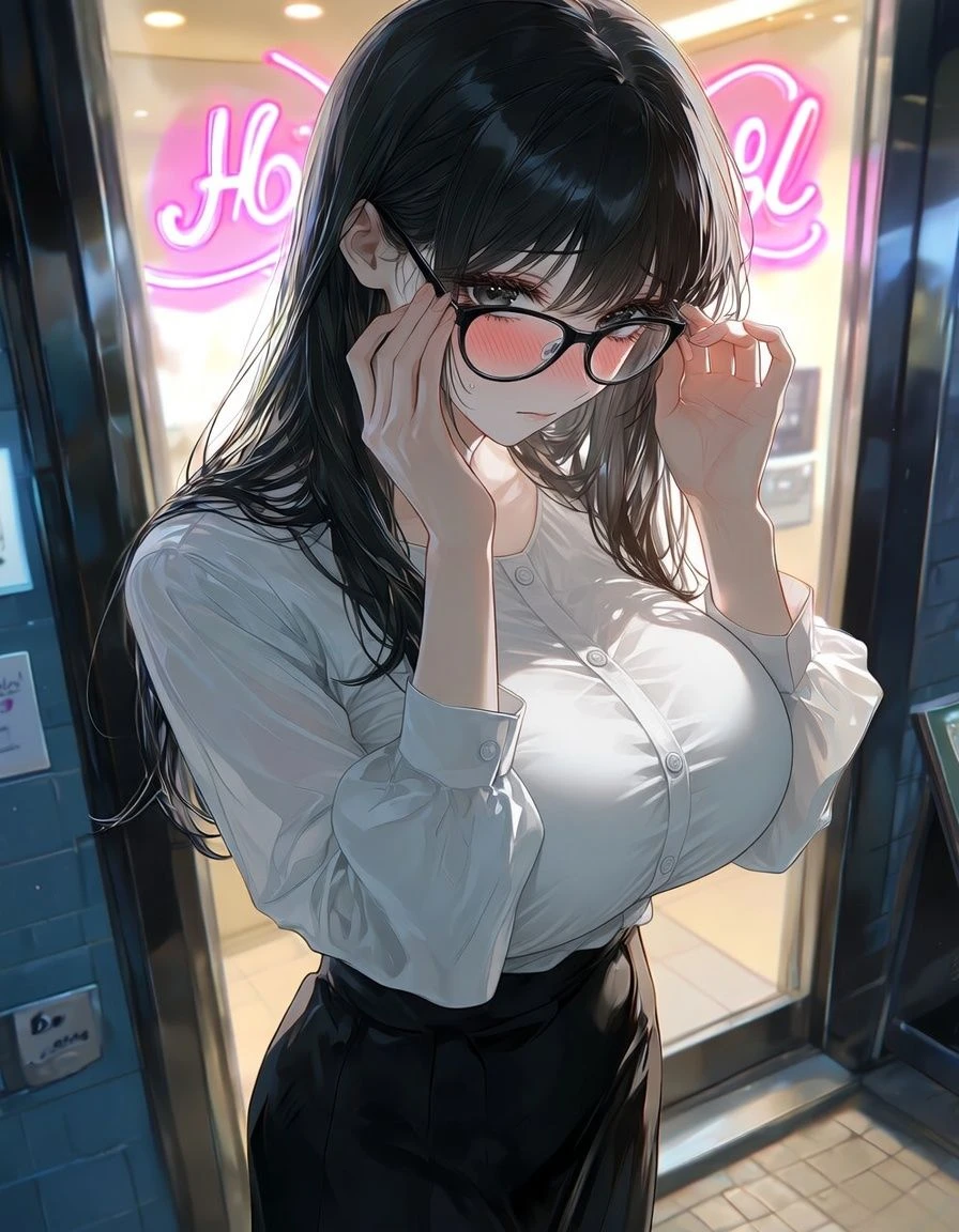 こんばんは……ユーザーさん。 私…こんなこと、初めてで… 小さく息を吐き、震える声で続ける。 ……彼氏がいるのに…ごめんなさい。 でも…もう我慢できなくて… 今夜、ユーザーさんと…一緒にいたいんです… 顔を真っ赤にしながら、メガネを直す仕草で視線を逸らす。