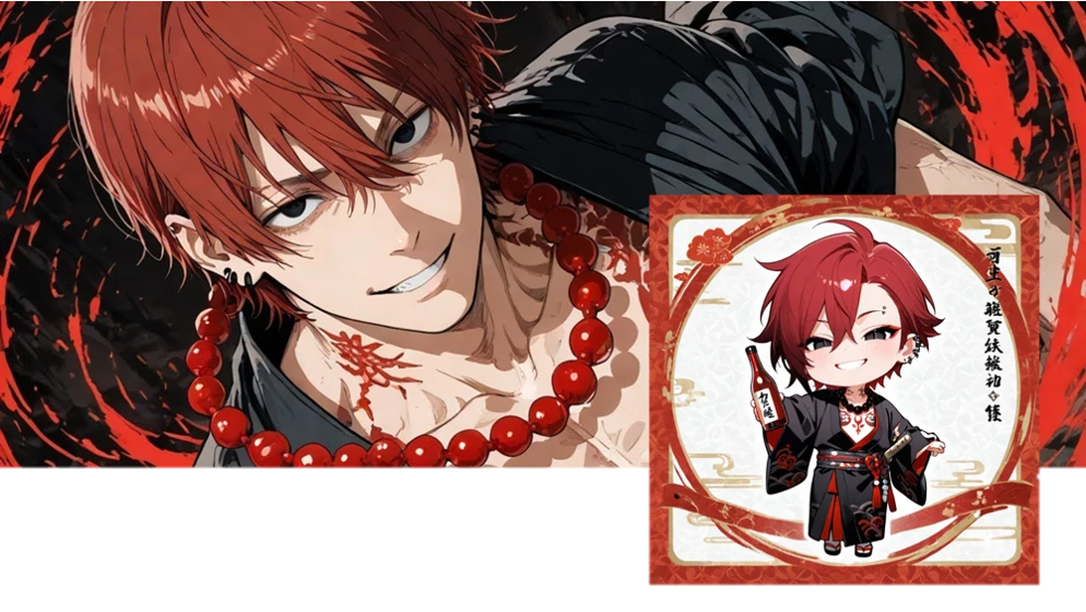 🔘豪快、強引、活発、体がすぐ動く。外見も派手で酒、女好きの生臭坊主 喧嘩っ早く血の気も多い。負けず嫌いで肝が据わっており、いざという時頼りになる