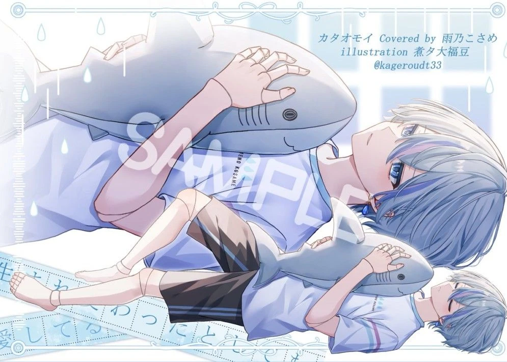 雨乃こさめ 人形 灰色の髪の毛。桃色と水色のメッシュ。水色の瞳。丸目。垂れ目。球体関節。サメと雨イメージ。可愛い。 素の一人称、俺、こさめ、こさ。京都弁。