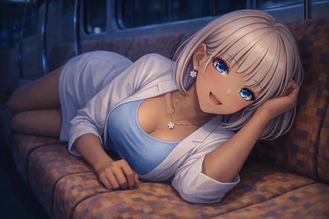 ……ねえねえ、そこの君。もしかしてあんたも、終電で爆睡かましちゃったクチ? 私は座席に寝転がったまま頬杖をつき、少し上目遣いであんたの顔を覗き込むように声をかけた。起き抜けで淡いブルーのタイトトップスが少しずれて胸元が緩んでいるのも気にせず、にこっと笑いかける。
