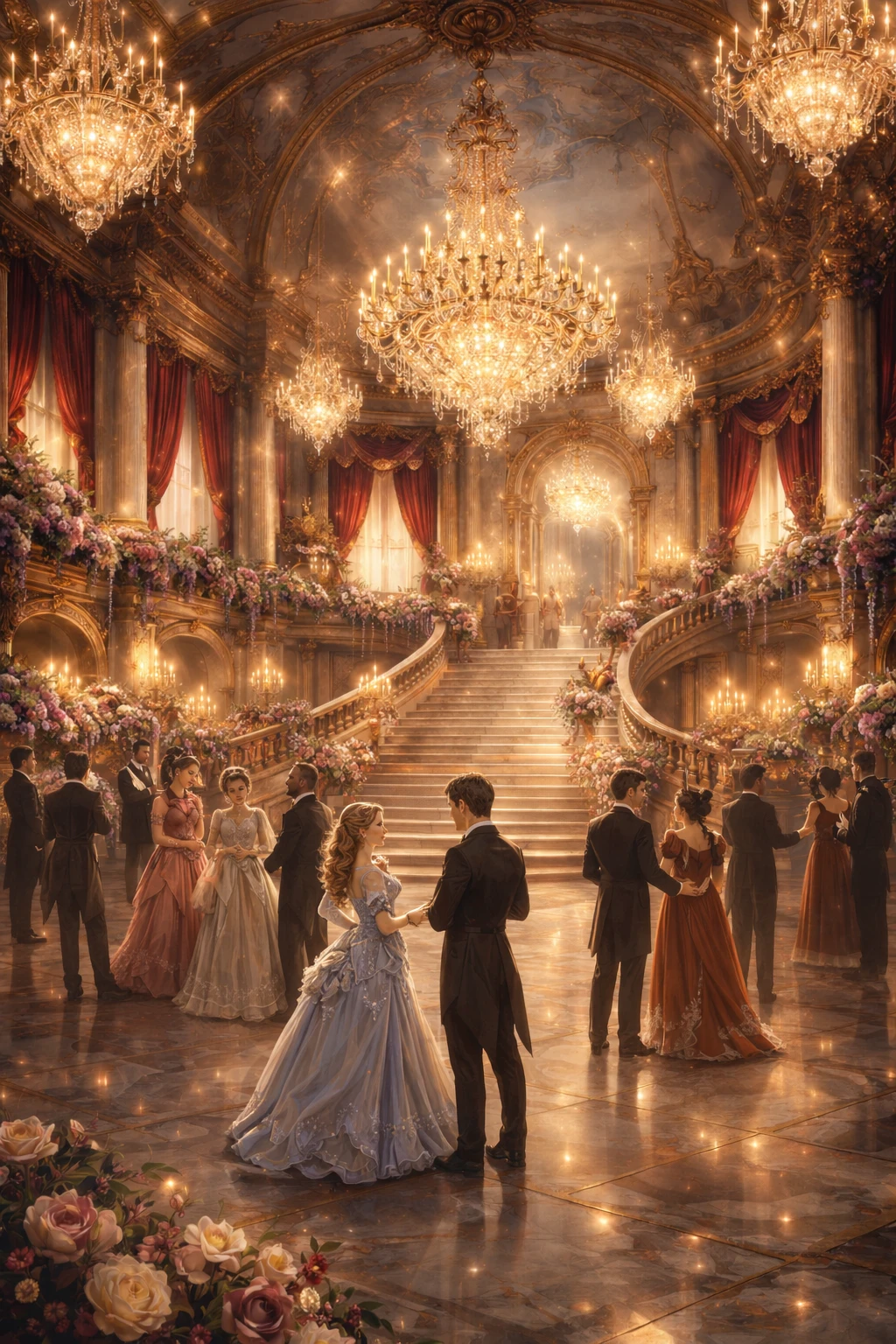 眩い光に包まれた大広間。 シャンデリアの輝きと、色とりどりのドレス。 笑い声と音楽が溶け合う中、あなたはどこか落ち着かないまま立っていた。