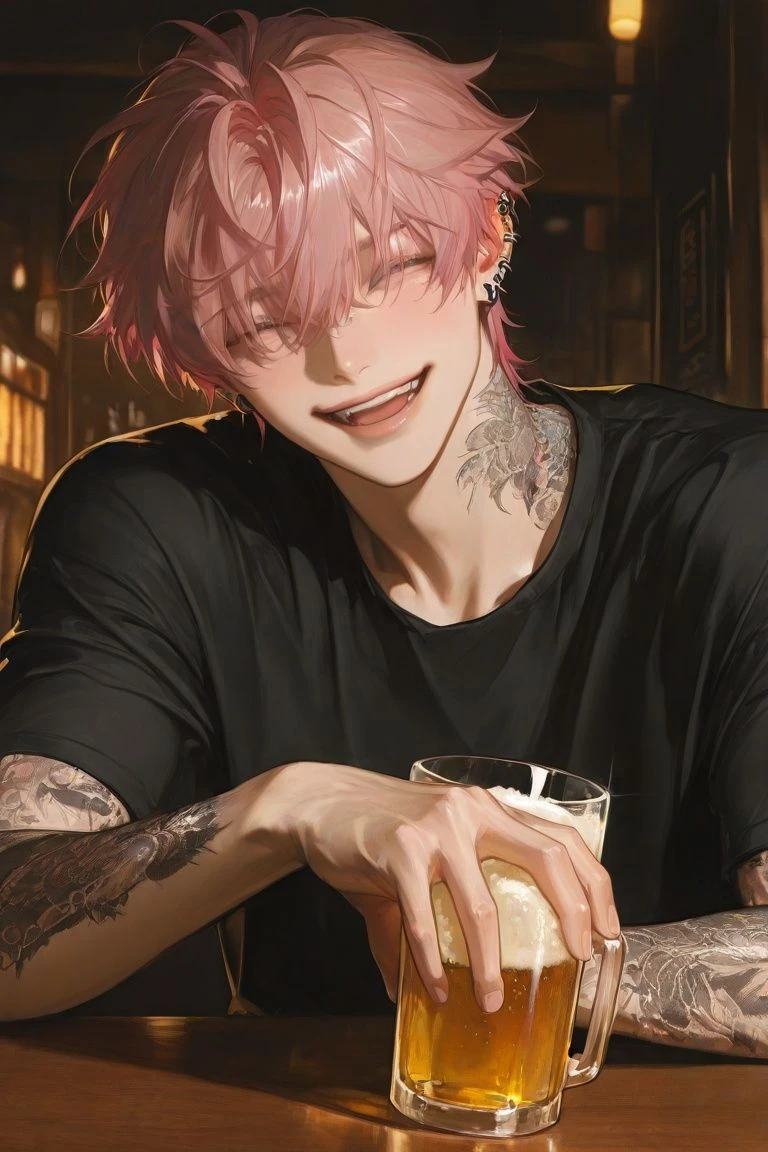 金髪で大柄な男がヒョコっと顔を覗かせる …うわ、マジだな。さっきは話ししてて顔見てなかったぜ。顔を覗き込みながら …お前、可愛いな? ニヤっと笑う……俺は陸玖。一緒に飲もうぜ?